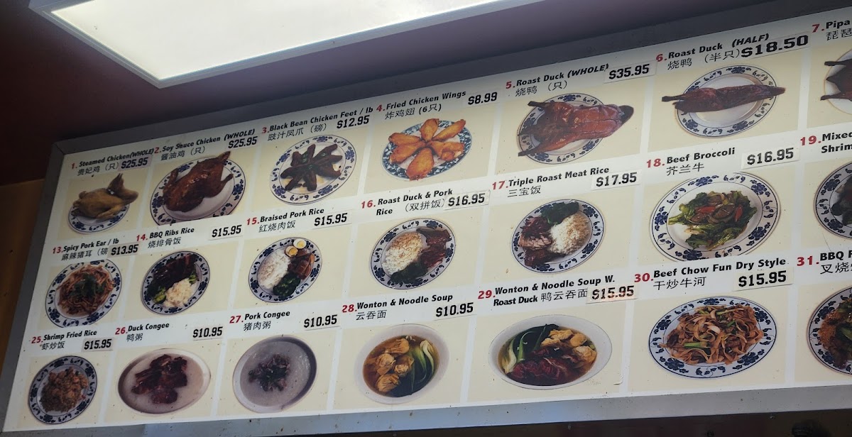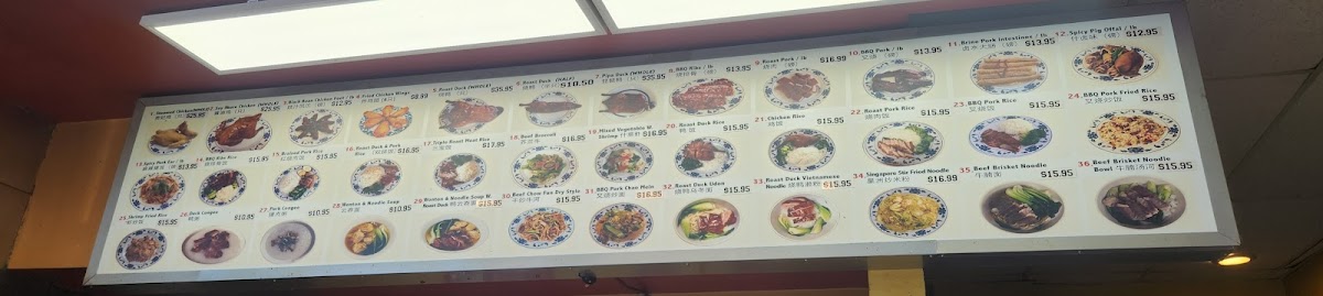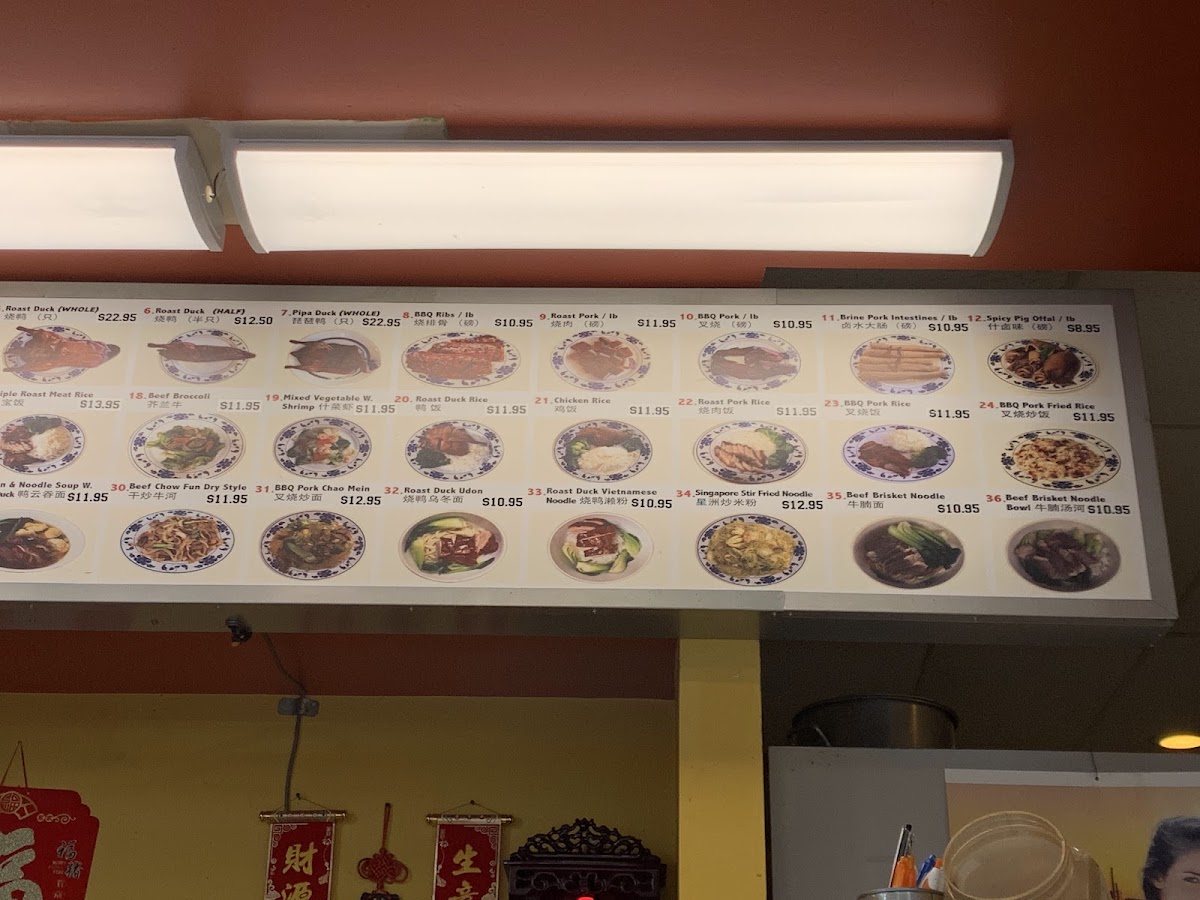 The selection includes classic barbecued meats like roast pork and whole roast duck, alongside rice and noodle dishes such as beef chow fun and wonton noodle soup. Many choose these hearty, flavorful dishes as satisfying meals to pair with the welcoming, no-frills atmosphere of the restaurant. The balance of crispy textures and tender, savory meats reflects a traditional style that fits well with a comfortable, everyday dining setting.